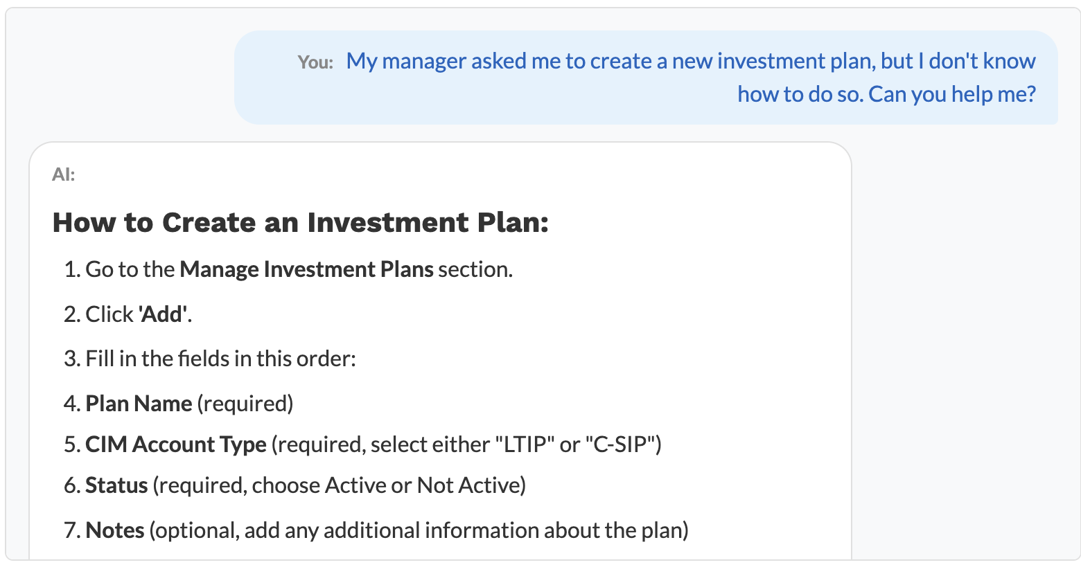 Handling “How To” guidance required a different strategy. An AI agent answering, “How do I do this action in CIM?” theoretically needs full insight into the application’s code or access to detailed documentation (a great potential for a Confluence Model Context Protocol). Sending the entire code base to the LLM is unrealistic, so to work around this, I used Cline, connected to the Cornell AI Gateway, to review CIM’s code base and to compile instructions, rules, and procedural steps that cover common user actions. The Gateway was then instructed to transform these into static “knowledge base tools” that the AI agent can consult when responding to user onboarding and workflow questions. In effect, the AI draws on a pre-computed map of CIM’s functions rather than discovering them dynamically, which keeps it consistent but requires updates whenever the code or workflows change.