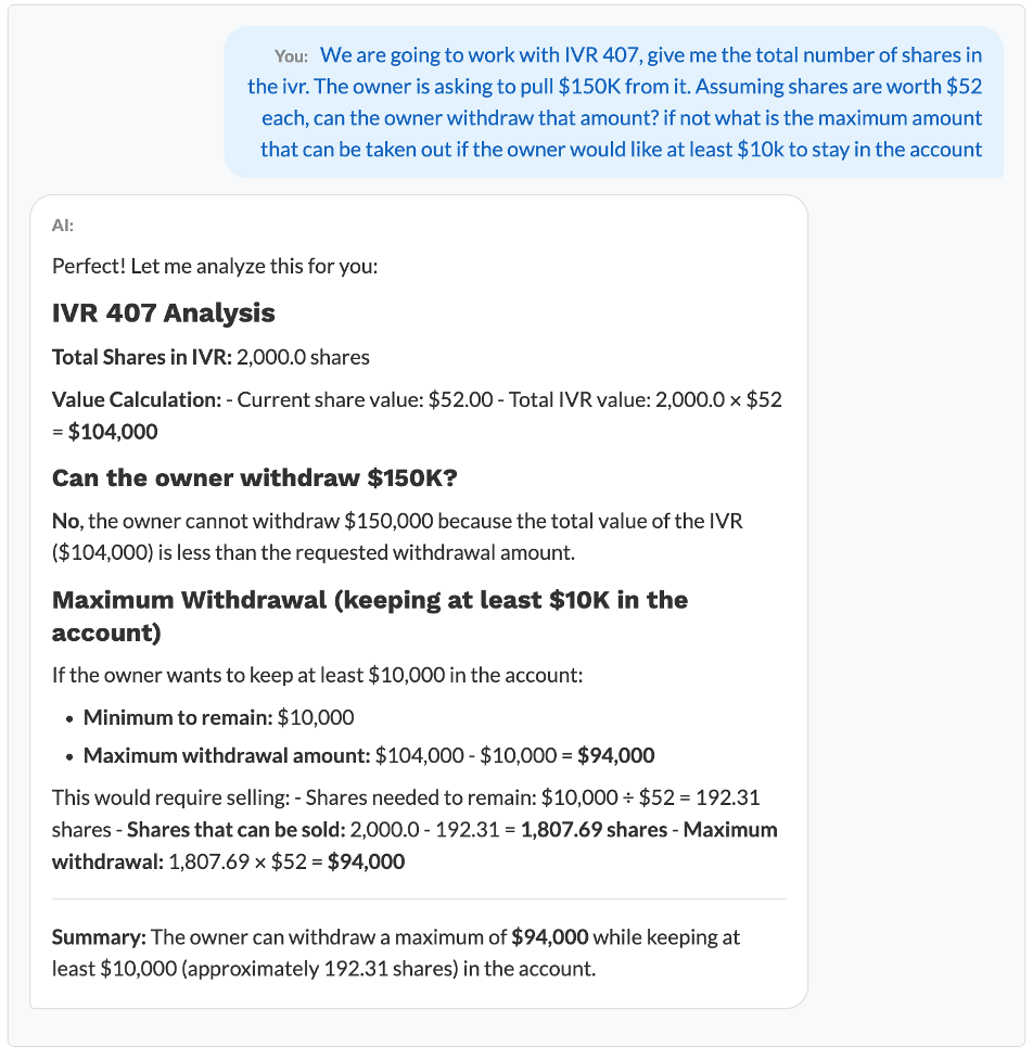 To demonstrate this capability, I created a hypothetical account containing a mock investment. This example below does not involve real institutional data, actual users, or any real financial figures. The AI correctly applied the limitations I specified when evaluating the mock investment and provided an advisory response to the request.