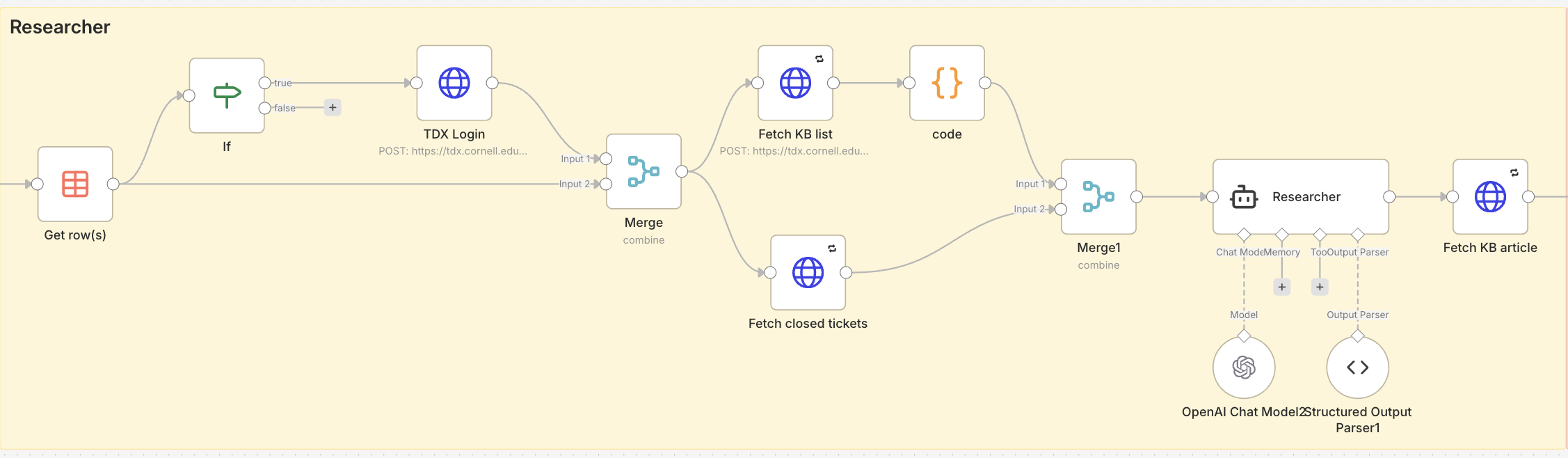 The multi‑agent workflow was built in AI Agent Studio, a workflow automation tool within Cornell’s AI Platform, powered by N8N. The Agent Studio allowed each agent to run in its own node and communicate through defined input and output channels. This structure makes it easier to connect agents to specific tools and APIs, and to control the sequence in which tasks are performed.